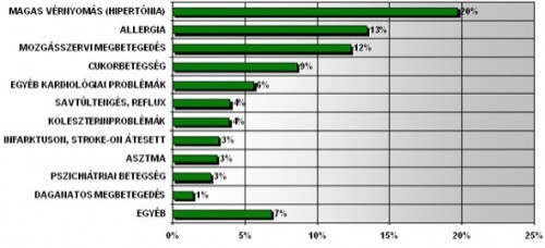 A fenti szám már csak azért is aggasztó, mivel a krónikus betegségek állnak a halálozási lista élén, az Egészségügyi Világszervezet (WHO) által kiadott legújabb haláloki lista szerint világszerte megelőzték a fertőző betegségeket. Hazánkban a betegek aránya valamivel magasabb az 55 év felettiek, a Kelet-Magyarországon élők, az alapfokú végzettségűek és az alacsony jövedelemmel rendelkezők körében. Elgondolkodtató adat az is, hogy a legfiatalabb felnőtt - 18 és 25 közötti - korosztályhoz tartozók 39 százaléka is valamilyen krónikus betegségben szenved. Magyarországon a leggyakrabban előforduló krónikus betegség továbbra is a magas vérnyomás, amely hazánkban a vezető halálokok egyike - e betegségben a teljes magyar lakosság 20 százaléka szenved. Előfordulása az életkor emelkedésével nő: míg fiatalabb korban jóval az átlag alatti, 55 éves korig pedig átlag körüli, addig ezen életkor felett már 30-40 százalék a magas vérnyomással rendelkezők aránya. Kiugróan magas a betegségben szenvedők aránya a nyugdíjasok körében: 69 százalék. A krónikus betegségek listájában második helyen találjuk az allergiás megbetegedéseket, amely a lakosság 13 százalékát érinti. Ez a szám is drasztikusan nőtt az elmúlt 1-2 évben, hiszen korábban csak 7-9 százalékos volt az allergiában szenvedők aránya. A magas vérnyomással szemben az allergia inkább a fiatalokat érinti. Előfordulási aránya a 18-25 év közöttiek körében a legmagasabb (27 százalék), de a 26-45 év közötti korosztály esetében is átlagon felüli az érintettség. További gyakran előforduló krónikus betegségkör a mozgásszervi megbetegedéseké, illetve a cukorbetegség. Előbbi probléma jelenleg a felnőtt magyar lakosság 12 százalékát érinti, elsősorban az idősebb korosztályt (65 év felett 26 százalék), utóbbiban pedig minden 10. magyar lakos szenved.