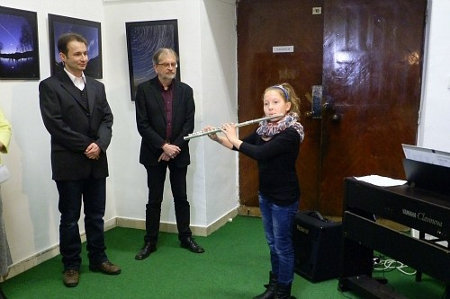 A tárlatvezetés után a csillagászat és a zene találkozott: Ladányi Tamás videójához Kövi Szabolcs fuvolaművész adott zenei aláfestést.