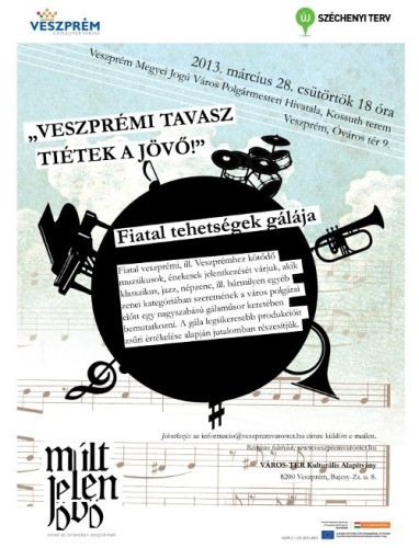 Fiatal veszprémi, ill. Veszprémhez kötődő muzsikusok, énekesek jelentkezését várjuk, akik klasszikus, jazz, népzene, ill. bármilyen egyéb zenei kategóriában szeretnének a város polgárai előtt egy nagyszabású gálaműsor keretében bemutatkozni. A gála legsikeresebb produkcióit zsűri értékelése alapján jutalomban részesítjük.