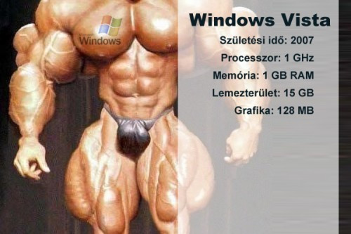 Izomzat tekintetében, ennél még meglepőbb arányt tapasztalunk! A vén csont 6.5 MB szabad területet vesz el környezetétől, míg a Vista 15 GB-os versenysúlyra tett szert doppingszerektől duzzadó testével. Mintha egy 80 kilós felnőtt készülne farkasszemet nézni a 18 tonnáig megpakolt, sokszáz lóerős kamionnal.