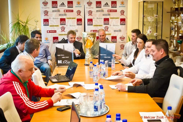 A huszonegyszeres kupagyőztes MKB Veszprém KC a pécsi esemény apropójából tartott sajtótájékoztatót az aréna serlegtermében csütörtök délután.