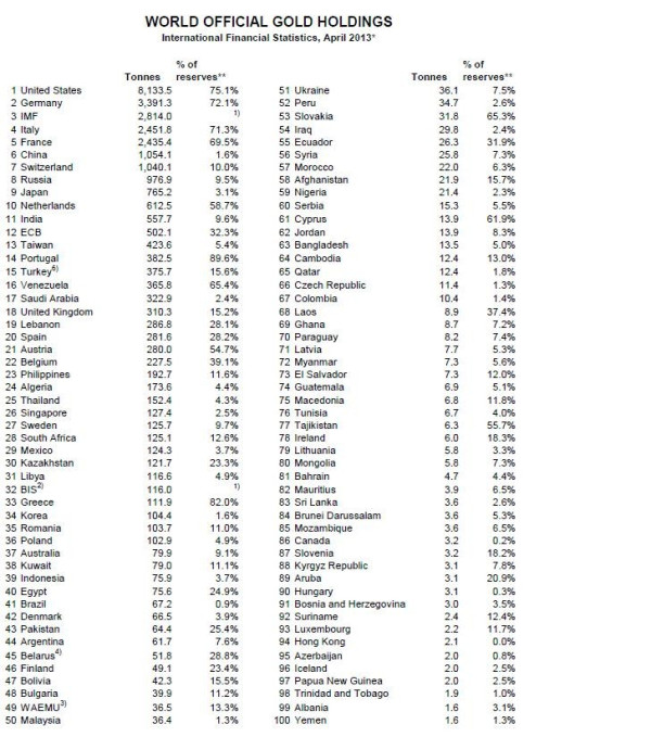 Alább megtalálhatóak a legnagyobb aranytartalékkal (tonnában kifejezve) rendelkező országok listája, amin a Nemzetközi Valutaalap és az Európai Központi Bank is szerepel.