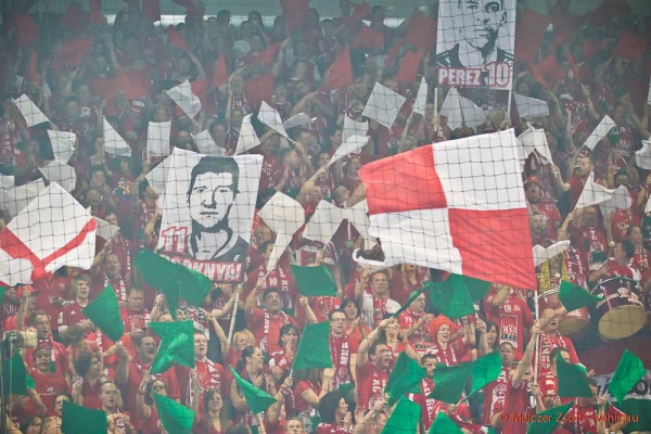 A hazai drukkerek korábbi ígéretüknek és a tétnek megfelelően elementáris hangerővel buzdították kedvenceiket. A „B-közép” már háromnegyed órával a kezdés előtt elfoglalta a helyét, s olyan lendülettel szurkolt, mintha máris a találkozó legkiélezettebb szakaszához értek volna. A pirosba öltözött szurkolóhad fantasztikus élőképet varázsolt a sorozat himnusza alatt a kapu mögötti lelátóra: piros, fehér és zöld lobogók tengerében a korábbi legendák – Éles, Csoknyai, Gyurka és Perez – arcképét feszítették ki.
