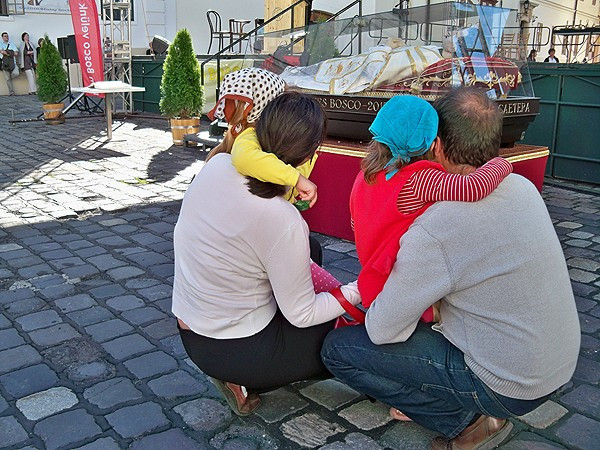 Vidám animátorok mozgatták meg a tengernyi kisgyereket a Szentháromság téren, készítve őket Don Bosco ereklyéjének érkezésére. Amíg a szentről készült életnagyságú viaszszobor, úton volt, magyar, vietnami, és indiai Szalézi szerzetesek szórakoztatták a közönséget.