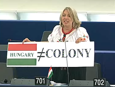 A jobbikos Morvai Krisztina ironikusan gratulált Tavaresnek, amiért - mint fogalmazott - jelentésével "nagyszerű munkát végzett", nagy szívességet tett a nacionalistáknak és az euroszkepticimzusnak - majd felmutatott egy "Magyarország nem gyarmat" feliratú, angol nyelvű táblát.