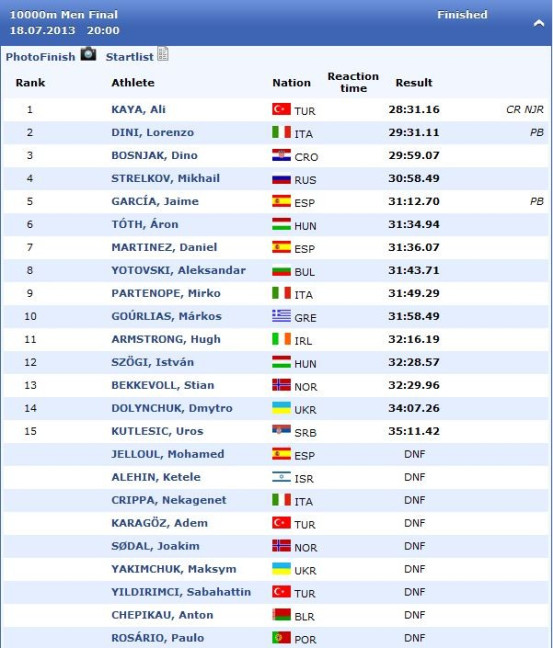 A csütörtöki nap utolsó versenyszáma volt a férfi 10.000 méter, ahol két veszprémi futó, Tóth Áron és Szögi István képviselte városunkat. A 24 rajthoz állt versenyzőből csupán 15-en fejezték be a versenyt, köztük a két veszprémivel: Tóth Áron hatodikként (31:34,94) ért célba, Szögi István pedig tizenkettedik (32:28,57) lett. A VEDAC futóit Tóthné Stupián Anikó készítette fel.