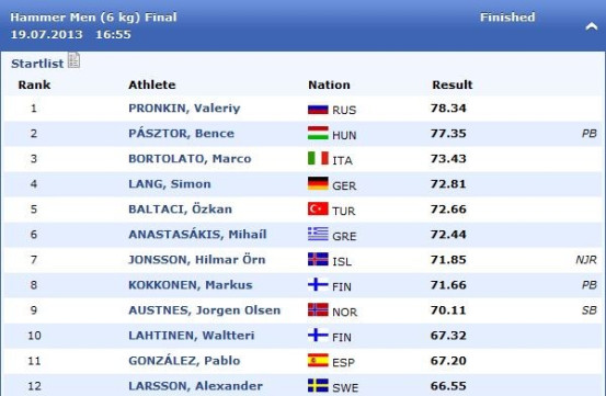 A férfi kalapácsvetés (6 kg) döntőjét péntek délután rendezték, ami a VEDAC ifjúsági világbajnoka, Pásztor Bence és az orosz Valeriy Pronkin külön csatáját hozta. Mindkét versenyző érvénytelen kísérlettel kezdett, majd a második sorozatban Pronkin átvette a vezetést. Zentai Tibor tanítványa a negyedik sorozatban új egyéni csúcsot, 77,35 métert ért el, és kétszer is 70 méter közelében (76,93, 76,99) teljesítetett. A versenyt Pronkin nyerte 78,34 méterrel, Pásztor Bence az ezüstérmet szerezte meg, közel négy métert verve a harmadik helyezett olasz Bortolatora.