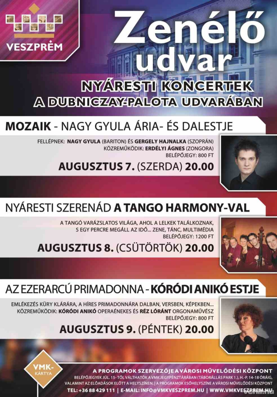 Csütörtökön a Tango Harmony zenekar szórakoztatja a Dubniczay-palota udvarára érkezőket. Az argentin tangó reneszánszát éli napjainkban, nem véletlen, hogy a professzionális muzsikusokból álló zenekar volt az idei Anna bál vendége is. Produkciójuk különleges, nemcsak koncert. Mesélnek a dalokról, miközben táncosok is kísérik a műsor és a multimédiás vetítés még inkább fokozza a látványt és hozzájárul, hogy Piazzola világában ,Buenos Airesben érezzük magunkat.