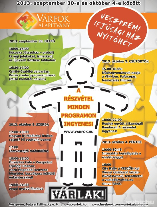 - 16:00 City Rally a VEDIÖK-kel A Veszprémi Diákönkormányzat és a Veszprémi Ifjúsági ház városi vetélkedőt hirdet középiskolás diákok számára.