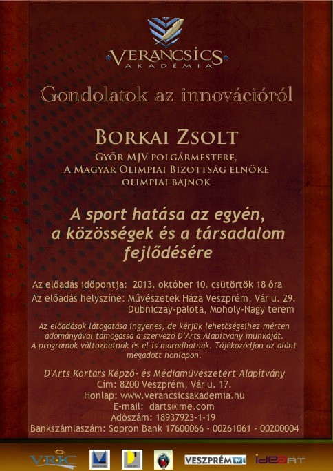 Október 10-én Borkai Zsolt MOB-elnök tart előadást a sportról a Dubniczay-palotában.