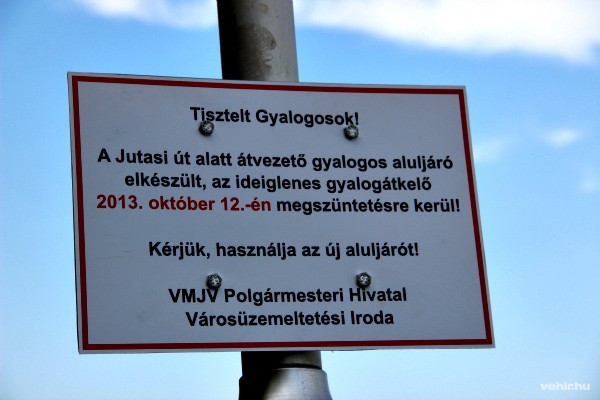 Kovács Zoltán a városüzemeltetési iroda vezetője kérdésünkre elmondta, hogy a gyalogátkelőhely megszüntetése már a Jutasi és a Budapesti út kereszteződésénél kialakított körforgalom építése során felmerült, azonban az aluljáró felújítása miatt erre nem volt lehetőség. A gyalogátkelőhely megszüntetésével a gépjármű forgalom a Jutasi úton már négy sávon bonyolódhat, ezzel jelentősen csökkenthetnek a reggeli és délutáni torlódások a belvárosban. Kovács Zoltán hangsúlyozta, hogy a gyalogátkelőhely megszűnésével a gyalogosok biztonságosan és akadálymentesen érhetik el a Kossuth utcát az aluljárón keresztül.