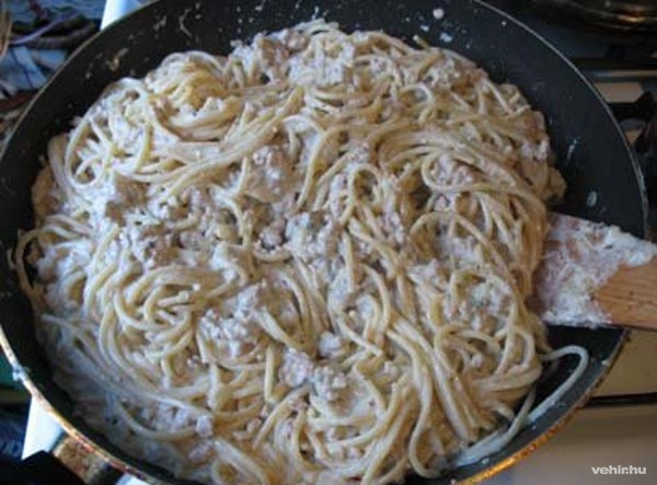Közben – majd elfelejtettem – felrakjuk a tésztavizet. Csak egy kis sót szórunk bele, nem követünk el semmi olajos böszmeséget! Tésztát mindig olaszt használunk, de nem Barillát, és egyéb drága kirakat-spagettit, hanem valami nónémet. Az ugyanolyan finom lesz, csak olcsóbb… Kizárólag fogkeményre főzzük, szűrés után megforgatjuk 5 deka vajban, és beleeresztjük a szúgónkba.