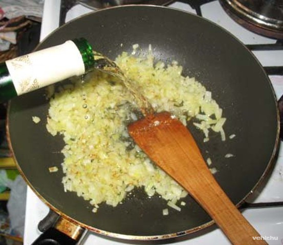Hámozzunk és kockázzunk fel két jóféle vereshagymát. Hidegen sajtolt olivát löttyintsünk a serpenyőbe, és pároljuk meg. Ha már üvegesedik, vegyünk elő egy üveg száraz fehérbort – mondjuk villányi Hárslevelűt –, kóstoljuk meg, és ha jó, öntsünk egy decit a hagymára.