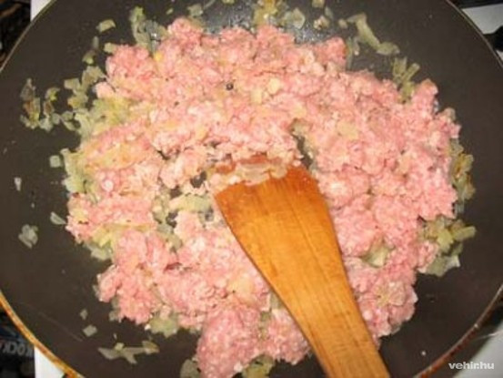 Nagyon fontos, hogy a darált húst alaposan szétmorzsolva keverjük a hagymához, így nem lesz darabos.