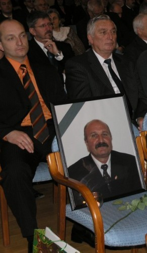 elhunyt Ács János képviselő emléke előtt. Helyén fényképe előtt gyertyát