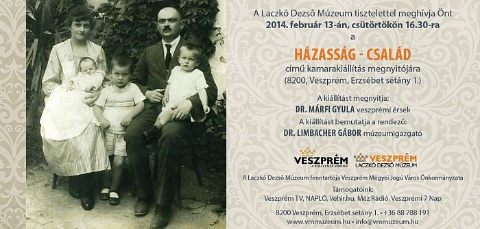 A Laczkó Dezső Múzeumban Valentin-nap előestéjén, a „Házasság hete” alkalmából nyílik meg a HÁZASSÁG – CSALÁD című kiállítás. A tárlat bemutatja a szent mintát, Boldogasszony menyegzőjét, filmen a kánai menyegző népi rítusát, és a Szent Család kultikus ábrázolásait, amelyek oltalomul bekerültek a falusi otthonokba.