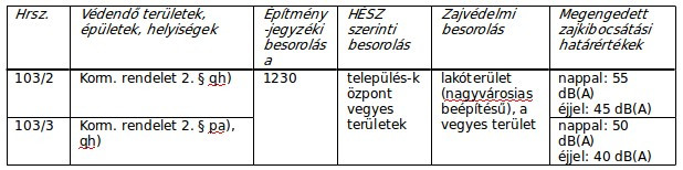 A hatásterület kiterjedése: A vendéglátó egység hatásterületét a Mérési jegyzőkönyv, valamint a Korm. rendelet 5. § (6) bekezdése és 10. § (3) bekezdésének a) - b) pontjai figyelembevételével állapítottam meg, így annak zajvédelmi hatásterületén lévő védendő területek, épületek, helyiségek az alábbiak: