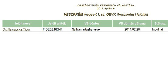 A Fidesz már kedden jelezte, hogy minden egyéni körzetben összegyűjtötték az induláshoz szükséges 500 aláírást. Dr. Navracsics Tibor neve mellett napokig a "döntésre vár" felirat szerepelt az NVI weboldalán, a választási iroda csütörtök délután vette nyilvántartásba a kormánypártok veszprémi jelöltjét. Városunkban jelenleg ő az egyetlen név a nyilvános táblázatban.