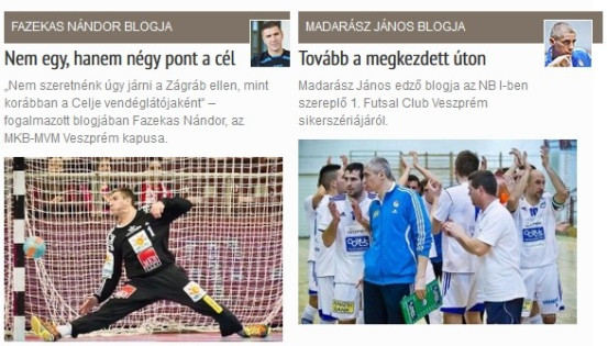 Büszkék vagyunk rá, hogy az MKB-MVM Veszprém kiválósága, Fazekas Nándor immáron negyedik éve a mi olvasóinkkal osztja meg gondolatait blogjában. S hasonlóan nagy örömünkre szolgál, hogy az egyre népszerűbb 1. Futsal Club Veszprém edzője, a magyar válogatottsági rekorder, Madarász János is nálunk vezeti internetes naplóját. A két kedvenc írásai hétről hétre kiemelt nézettséggel bírnak, melyeket továbbra is nálunk, tehát mostantól a vehirsport.hu weblapon követheti figyelemmel.