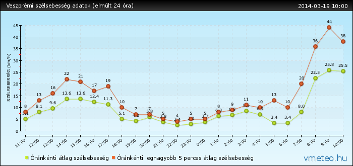 A szélerősség növekedése a VMeteo.hu szélerősség-grafikonján is megfigyelhető, az óránkénti legnagyobb 5 perces átlag szélsebesség reggel a 44 km/h-t is elérte.