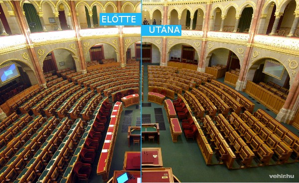 Egymás mellé tettük az MTI februári és áprilisi fotóját az időközben átalakított alsóházi ülésteremről.