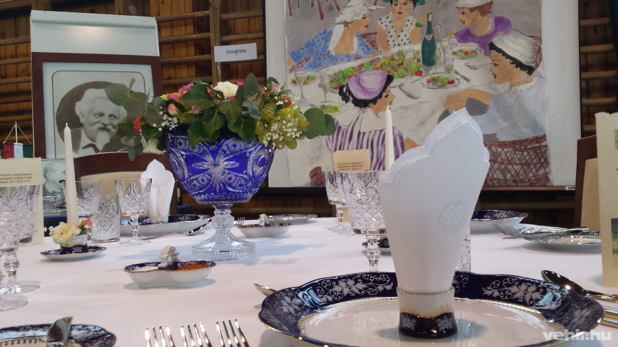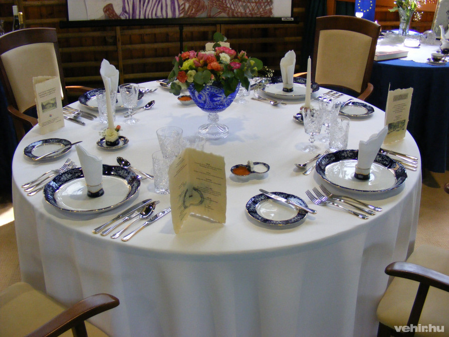 A szakácsok munkájával egy időben zajlott a pincéreké. Először meg kellett teríteni egy díszasztalt, amit mi a 19-20. századi tradicionális éttermi és kávéházi hangulathoz illeszkedően alkottunk meg: kéken csillogó Zsolnay tányérokat, csiszolt kristálypoharakat tettünk fel az asztalokra, kicsit visszafogottabb, főként nyári gyümölcsökkel és mezei virágokkal tarkított bokrétákat helyeztünk el a hófehér abroszon. A korszakhoz híven kötelezően kiraktuk a menükártyát a felszolgált ételekről és a hozzá illő hazai borokról. Egy autentikus hátteret is megteremtettünk, a versenynek helyt adó tornacsarnok bordásfalát egy kézzel festett, kávéházi kisasszonyokat ábrázoló vászonnal takartuk el.
