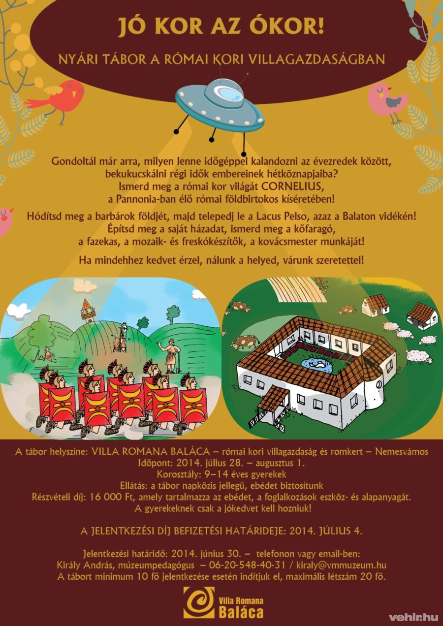 A nyár sok gyereknek egyet jelent a táborozással. A rendkívül széles kínálatban üde színfoltként jelentkezik a római kort bemutató balácai tábor július 28 - augusztus 1. között, a Laczkó Dezső Múzeum szervezésében.