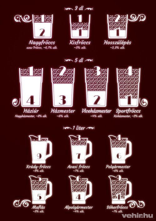 Fröccsöt fogyasztani az utóbbi években itthon egyre népszerűbb, hódoljunk ennek, ha inkább felfrissülnénk, és később bódulnánk be. Krúdy-fröccs, Viceházmester, kisfröccs, nagyfröccs, hosszúlépés… stb, stb. Ezeket mind-mind hallottuk, de sokszor keverjük őket. Íme egy egyszerű infografika a legismertebbekhez.