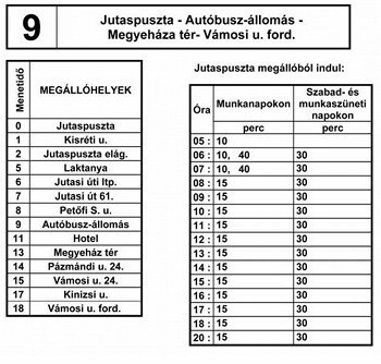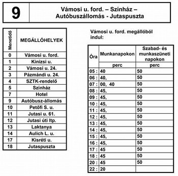 A 9. sz. vonal járatai nem érintik a Haszkovó és Munkácsy úti megállóhelyeket. A járat a Jutasi úton közlekedik, és végállomása a Vámosi úti forduló.