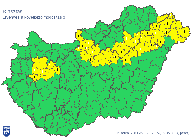 Az Országos Meteorológia Szolgálat elsőfokú, azaz citromsárga riasztást adott ki a várpalotai, veszprémi, zirci, pápai, ajkai, sümegi és devecseri járás területére, ahol a várt csapadékmennyiség néhány tized milliméter lehet.
