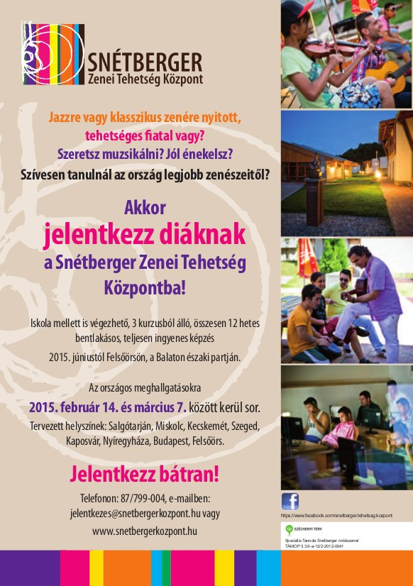 A Snétberger Zenei Tehetség Központ 2015 júniusban induló egy éves képzésére az alábbi helyszíneken és időpontokban hallgatja meg a jelentkezőket: