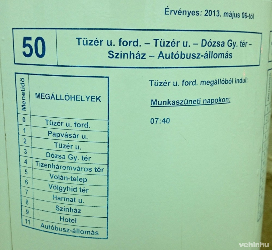 Az Balaton Volán Északnyugat-magyarországi Közlekedési Központ Zrt. veszprémi helyi járatos menetrendi tájékoztatója szerint az 50-es számmal ellátott vonalon hetente mindössze egy járat közlekedik a Tüzér utca és az autóbusz-állomás között. A Dózsából 7.40 órakor indul, vissza pedig 9.05 órakor szállhatunk fel rá a központban.