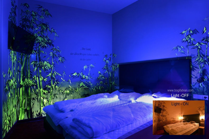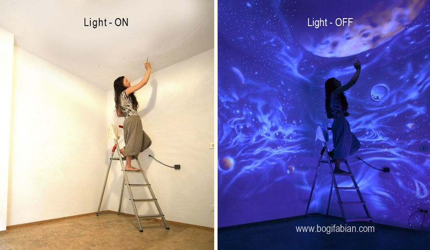 "Próbálok álombeli légkört teremteni, megfestem a falakat és padlókat, munkáimat pedig energiaforrásokkal és anélkül is láthatóvá teszem. Így a néző napfénynél és sötétben is megtapasztalhatja az eredményt, és annak mindegyik oldalát élvezheti. A célom, hogy egyedi tereket és szobákat hozzak létre, lelket és egyéniséget adjak nekik, ahol a pihenés és az élet igazi élmény lesz" - fogalmaz a BoredPanda-n közzétett képeiről Bogi.