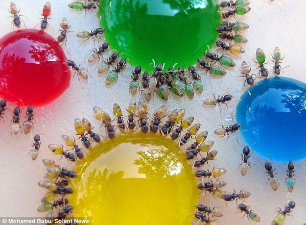 Mohamed Babu készítette ezeket a képeket, miután felesége észrevette, hogy a lakásukban kószáló hangyák fehér színűvé változtak a kiömlött tej elfogyasztása után. Babu megszínezett cukrozott vizet helyezett ki, majd lefotózta, ami ezután történt. A színek nemcsak láthatóvá váltak az állatok áttetsző emésztőrendszerében, de új árnyalatokká is összemosódtak azokban a hangyákban, amik több színből is falatoztak.