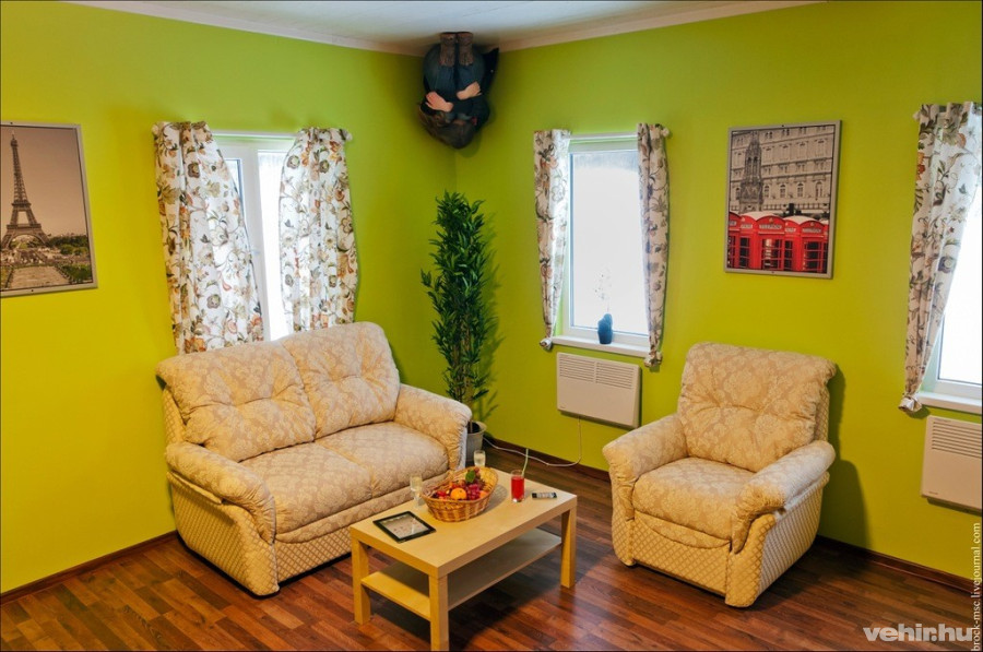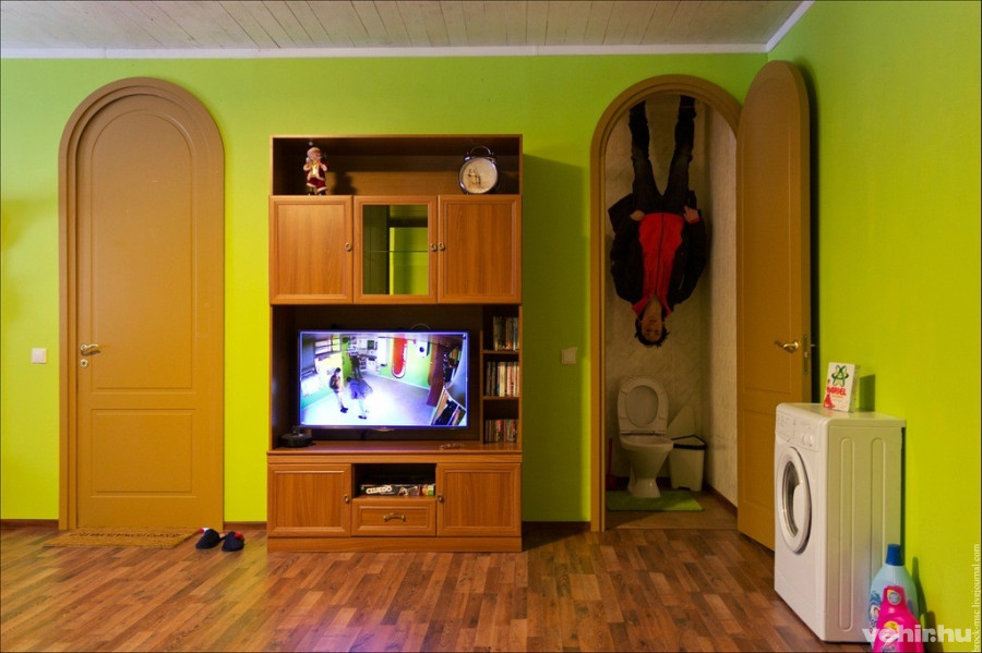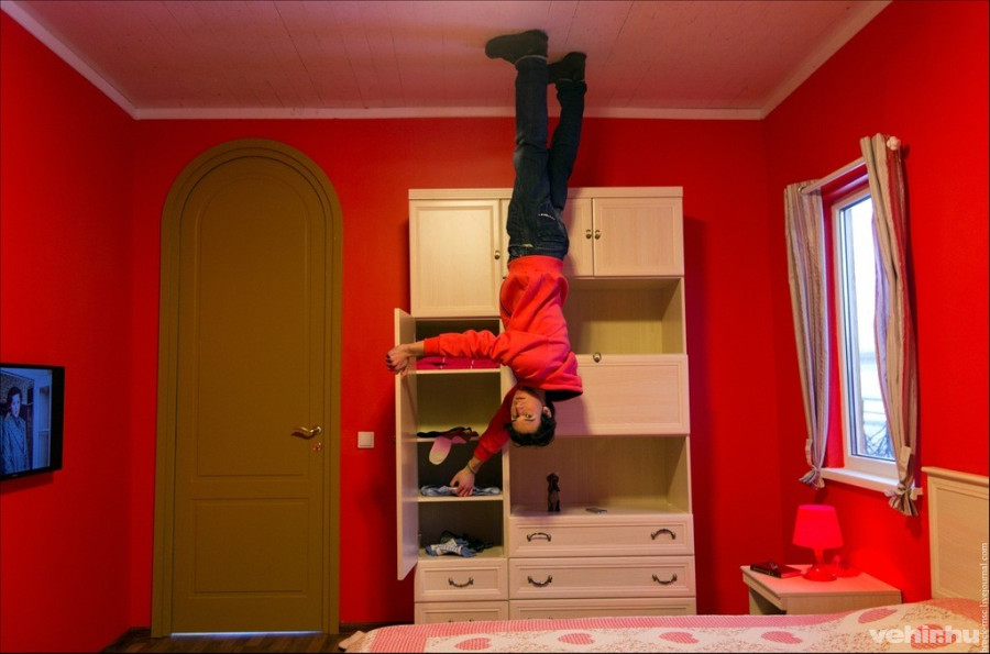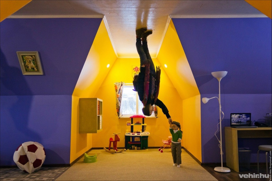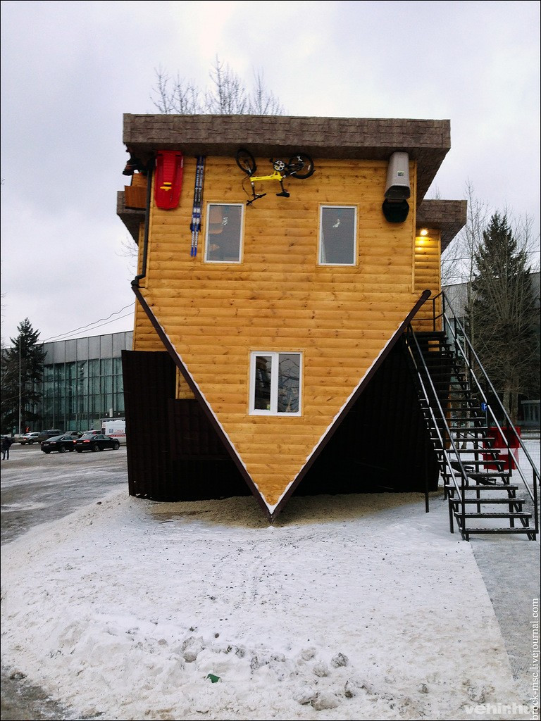 A moszkvai Kiállítási Központ területén fejjel lefelé építettek meg egy házat, hogy a látogatók nagyon mókás képeket tudjanak készíteni magukról.