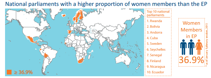 Az Európai Parlament Twitter-oldalán tette közzé azt az infografikát, amelyből kiderül: mely országok múlják felül az EP 36,9 százalékos arányszámát. A legmeglepőbb adatsor talán az, amelyben a világ tíz legjobban teljesítő (már ami a nők szerepvállalását illeti) országgyűlését sorolják fel. A TOP10-be mindössze három európai állam - Andorra, Svédország és Finnország - fért be, ellenben olyan, fejletlennek gondolt országok is szerepelnek a listán, mint Ruanda, Bolívia, Szenegál, Nicaragua vagy Ekvádor.