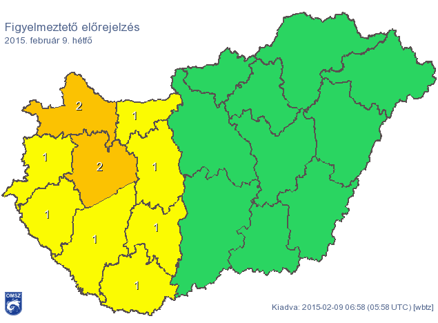 Hétfőn egy melegfront vastagodó felhőzete érkezik fölénk, a déli óráktól havazásra is számíthatunk, estig néhány cm friss hóval, a Bakonyban azonban megközelítheti a 10 cm is a lehulló hó vastagsága. Az esti óráktól a hó mellett havas eső is kialakulhat. Napközben gyakran fúj élénk északnyugati szél, ami az éjszakai órákban átmenetileg megerősödik, így hófúvásra kell számítani. A hőmérséklet 1°C körül tetőzik.