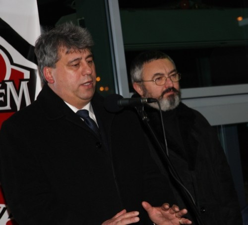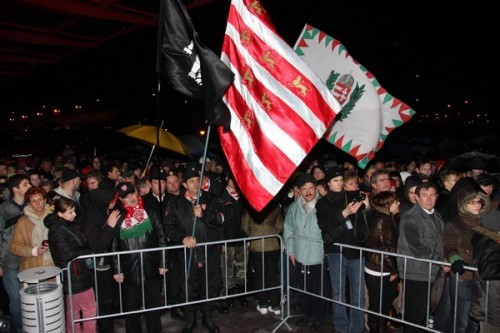 tömeg az Aréna előtt, ahol előbb Debreczenyi János, Veszprém polgármestere