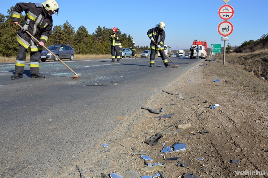 Egy gépkocsi, egy mikrobusz és egy élelmiszert szállító kamion karambolozott Veszprém megyében, a 8-as főút 45-46 kilométer közötti szakaszán. A beszorult utast feszítő-vágó segítségével szabadították ki, a sérülteket a mentők ápolják.