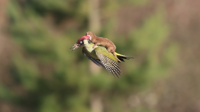 Az Essexben élő fotósnak, Martin Lee Maynek tegnap azokat a pillanatokat sikerült megörökítenie, amelyen egy Picus viridis (magyarul zöld küllő, egy harkályféle) légi ütközetbe keveredik egy Mustela nivalissal (menyét) a londoni Hornchurch Country Parkban.