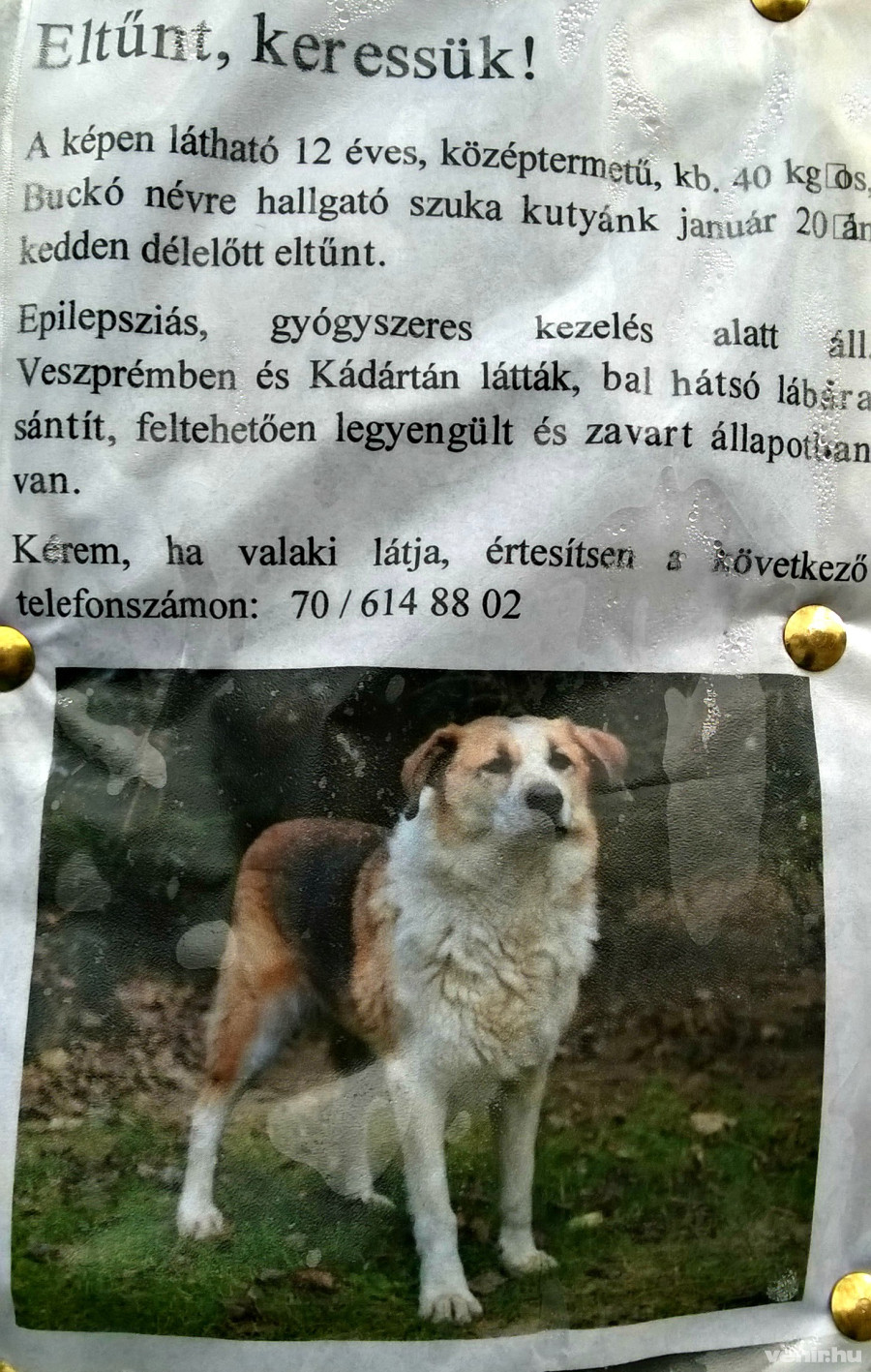 A Madách utcában leltünk az alábbi felhívásra, reméljük mielőbb előkerül a kutya: