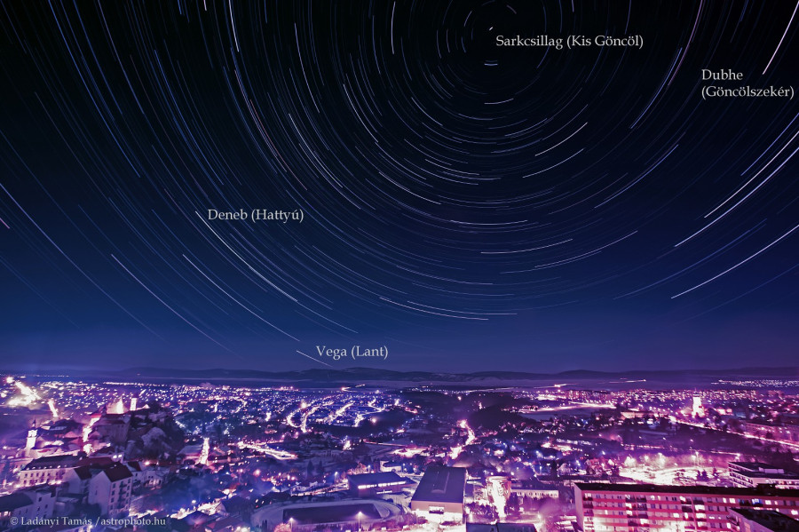 A mellékelt kép télvíz idején készült a „Királynék városában” közel két óra leforgása alatt. Baloldalon felismerhetjük a vár épületeit a Tűztoronnyal, míg jobb szélen a Margit templom zárja a kompozíciót. A háttérben a Bakony erős holdfénnyel derített havas vonulatai húzódnak. Az erős fényszennyezést a fotón egy speciális szűrővel sikerült csökkenteni; ezért is hiányoznak a város fényeiből a sárgás és narancsos színek, míg a kékes és vöröses árnyalatok jól megjelennek. Az égen a pólus körüli csillagívek között akkor ismerhetjük fel a csillagképeket, ha a kezdő vagy végpontjaikat kötjük össze. Jobboldalon a Göncölszekér fényes tagjai futnak ki a képből, míg a felvétel közepétől balra a Vega és a Hattyú konstelláció csillagainak lenyugvását figyelhetjük meg. Felül, a Kis Göncöl halványabb tagjai a népnyelvben „ég köldökének” nevezett forgási középpontban végződnek.