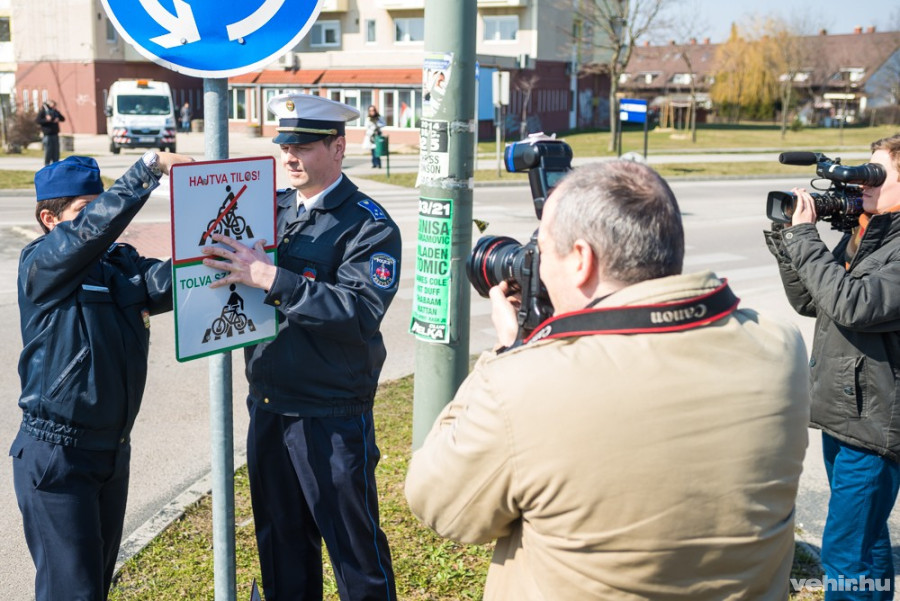 A balesetmentes közlekedés érdekében „Hajtva tilos, tolva szabályos” figyelem felhívó táblákat helyeznek ki 12 gyalogátkelőhelyre Veszprémben – hangzott el az első darabok felszerelése alkalmából a Cholnoky-lakótelepen.