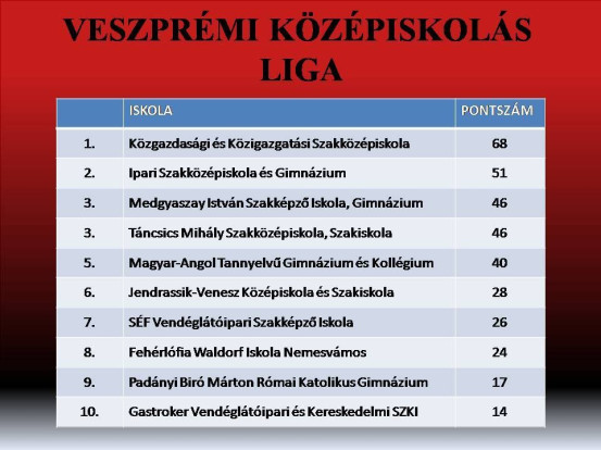 A forduló után így néz ki a Veszprémi Középiskolás Liga tabellája: