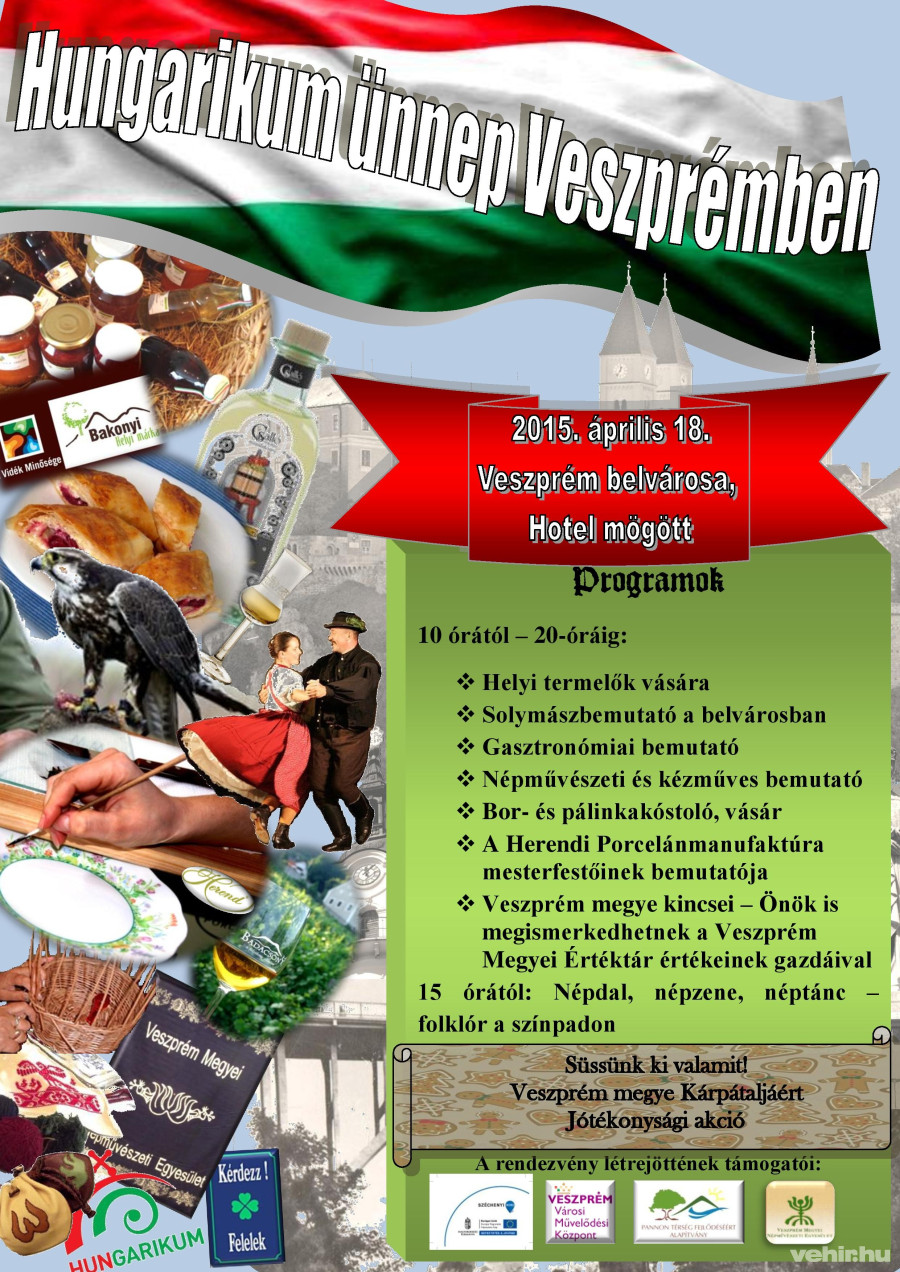 Dr. Horváth Zsolt, a szervezésben résztvevő Pannon Térség Fejlődéséért Alapítvány elnöke hozzátette, hogy a színes programok mellett a Hungarikum ünnepre kilátogatók megismerkedhetnek a városi és a megyei értéktár elemeivel is. Dr. Horváth Zsolt hangsúlyozta, hogy a rendezvény egy jótékonysági akciónak is otthont ad, ezzel kíván segíteni a rászoruló kárpátaljai magyaroknak. A résztvevők veszprémi háziasszonyok által sütött süteményeket kóstolhatnak pénzadomány fejében. A befolyt összeget a Kárpátaljai Népfőiskola Egyesület segítségével osztanak szét a szervezők a rászoruló kárpátaljai magyarok között.
