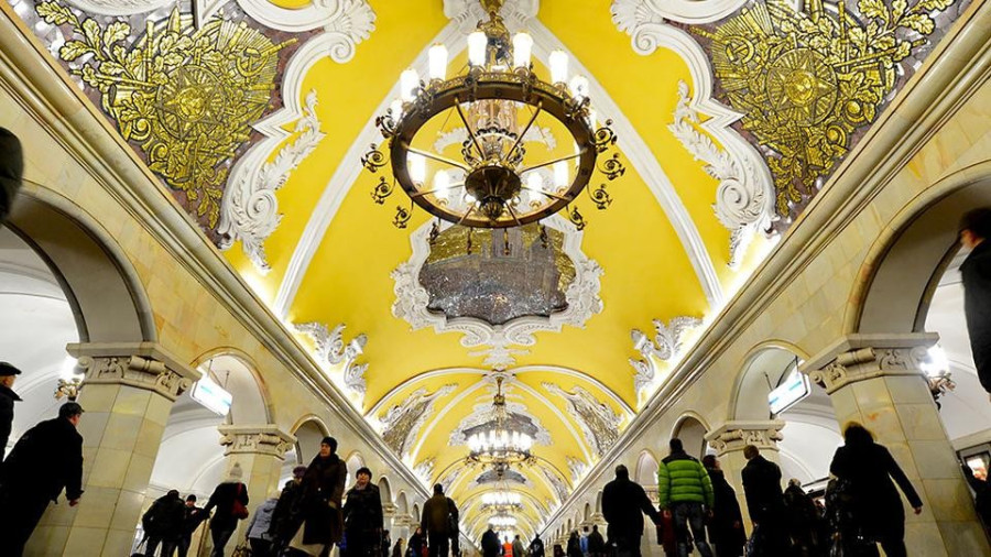 Nem spóroltak a moszkvai Komsomolskaya megálló tervezésekor. A hatalmas csarnokban korinthoszi oszlopok tartják a boltíves mennyezetet, amelyen nyolc mozaikkép látható, mind Pavel Korin alkotása, és orosz hősöket ábrázolnak. Korint és alkotótársait Sztálin-díjjal tüntették ki az 1952-ben átadott csarnok lérehozásáért.