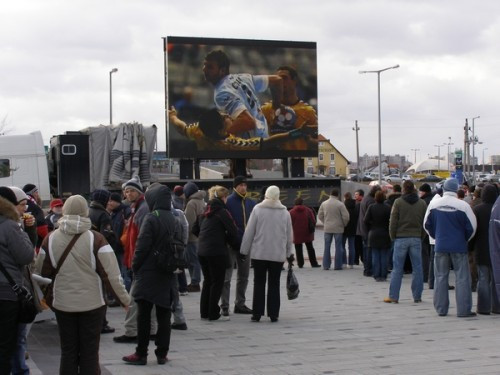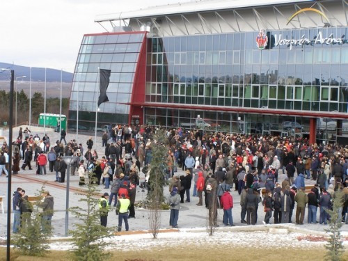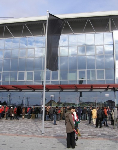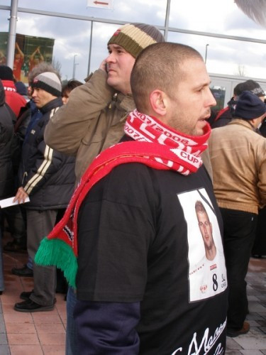 Pár perc van már csak hátra a meccs előtt. ekkor készültek kinti fotóink. Tapasztalatunk, hogy a hosszú felvonulás alatt mindenki az esemény aktualitásához méltón viselkedett. A hosszú menetoszlop csendben vonult a Patriótától az Arénáig, ahol nemcsak a jegyet váltók, a bérletesek, hanem az elhunyt iránt tiszteletet érzők nézték a hatalmas kivetítőn a megváltoztathatatlan múlt felemelő, mégis szomorú képeit.