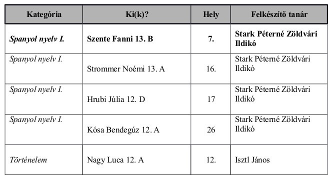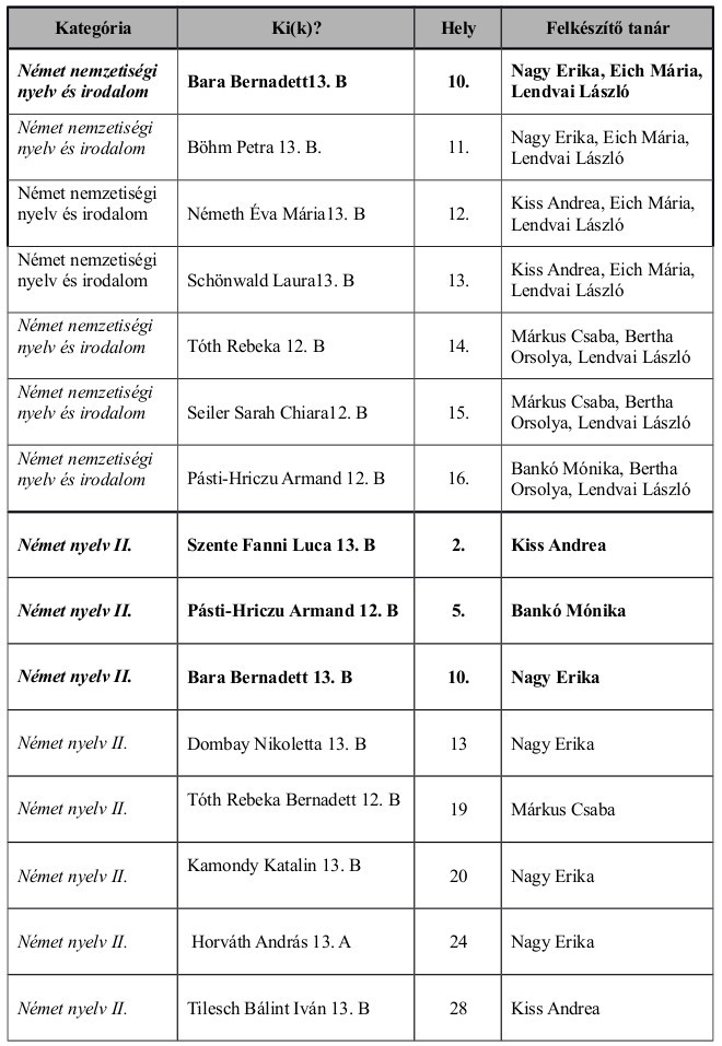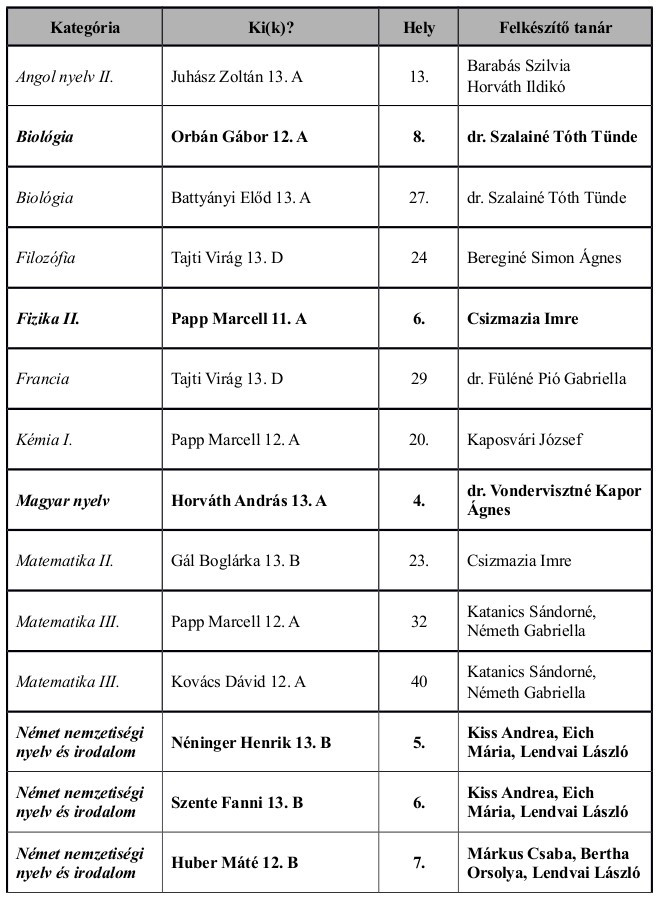 Tizenegyen végeztek a legjobb 10 között, összesen 6 kategóriában (biológia, fizika, magyar nyelv, német nyelv, német nemzetiségi nyelv és irodalom, spanyol nyelv).