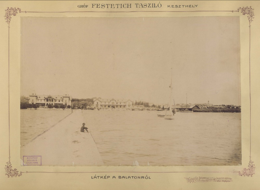 Keszthelyi kikötő, a parton a Hullám és a Balaton szálló, a háttérben, jobbra a Festetics kastély. A felvétel 1895-1899 között készült. (Fortepan / Budapest Főváros Levéltára. Levéltári jelzet: HU.BFL.XV.19.d.1.11.144)