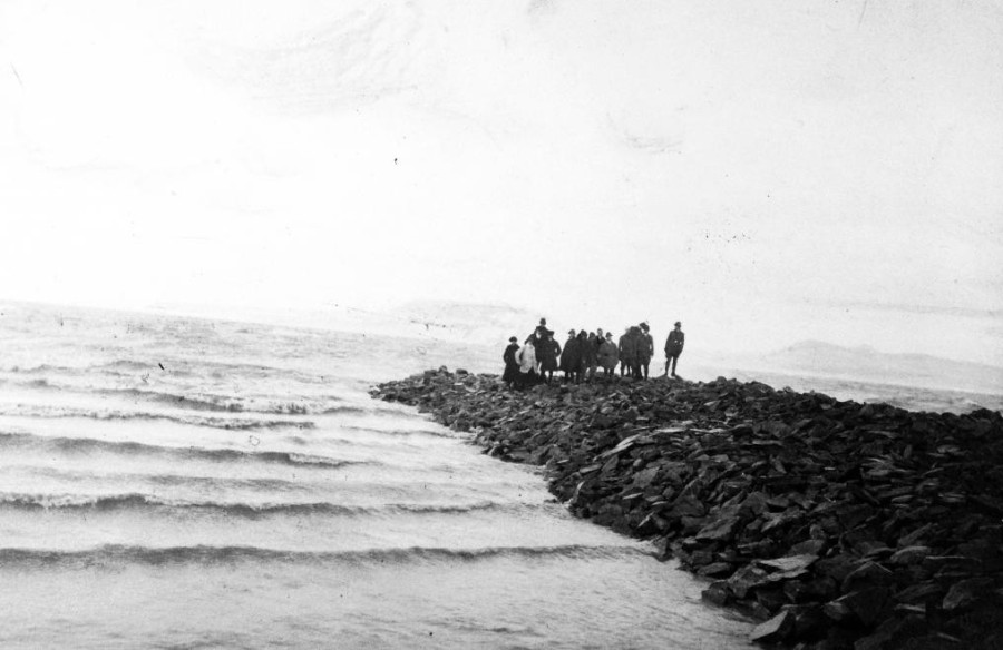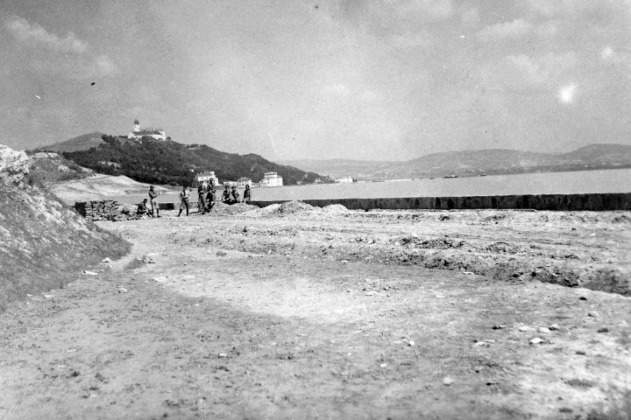 Épül a baloldali móló a balatonboglári Kikötő sétány végében. Háttérben a Badacsony. (Fortepan)